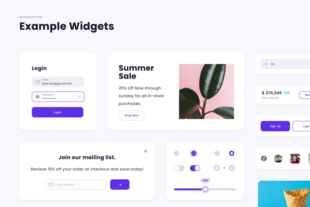 Buttons, Text Inputs, Checkboxes, Radios, Checkboxes, Toggles, Sliders, Increment Stepper, Tabs
